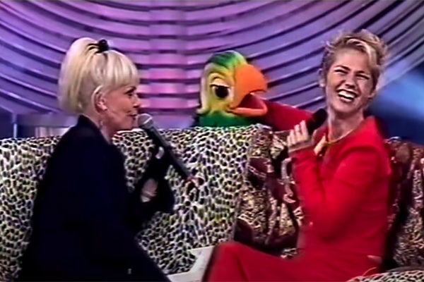 Logo que foi chamado à conversa, Louro José ficou posicionado atrás do sofá em que Xuxa e Ana Maria estavam. “É a Xuxa”, bradou o papagaio, que protagonizou momentos românticos com a anfitriã.